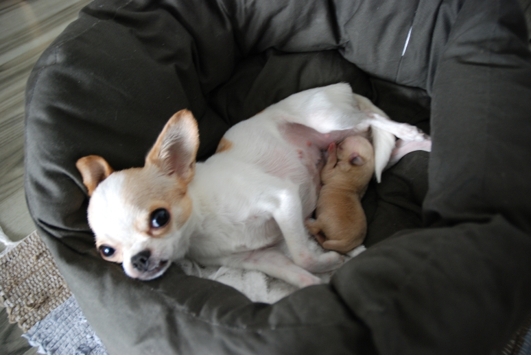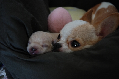昨日13日はシナモン6ヶ月目の誕生日でした! (書いてる間に日が変わってしまったが・・・) 6ヶ月目ですでに母親と同じ体重になっている 将来有望(?)なお転婆娘ですが 生まれたときはとっても小さくて脆くて 抱っこするのも緊張しましたww 生まれてすぐの頃の写真↓ プロフィールにも使っている写真ですが 次の写真と比べるとどれくらい大きくなったかがわかります↓ ほぼ同じ大きさ!! 『あたちが主役よ!!』とでも言いたげなシナモン。 態度は親よりもデカイかもねf(^^;) でもこーんなに小さかったね~↓ 産まれた日に書いた日記があるので そのまま載せちゃいますww *** 10月13日、ラテが赤ちゃんを出産しました。 出産前に病院でレントゲンを撮ってもらっていたのですが 赤ちゃんが一匹だけだったので、少し大きくなりすぎていて 獣医さんからは難産になるかもと言われてました。 獣医さんの心配は的中。。。 12日の夜11時くらいからいきみ始めるけど、なかなか産まれない。 通常は40分くらいで出産するのに、部屋の中をうろうろ 苦しそうにするばかり。。。 結局朝になっても産まれず、朝一で病院に行くことに(私も徹夜) 病院は朝9時からだけど、8時にはスタッフがいると聞いていたので 出発する準備をしていると7時半ごろ破水。 破水して1時間経つと赤ちゃんが酸欠になってしまうので 大急ぎでタクシーに乗り病院へ。 結局診察は9時からになってしまったけど 先生に事情を話すと、すぐに帝王切開をすることに。 手術は1時間くらいかかるし、結果は携帯で連絡をするから 家に帰っていいよと言われて、一度は帰ろうとしたけど でもやっぱり心配で・・・手術が終わるまで病院で待つことにする。 手術は1時間以上かかってしまったけど、母子共に無事でした!! 赤ちゃんの頭が骨盤に引っかかってなかなか出なかったらしい。。。 ラテは麻酔のせいでブルブル震えているしお腹の傷も痛々しかったけど そんな状態でも赤ちゃんを気にしてて・・・母は強し!!って感じ 赤ちゃんはふにゃふにゃしてて、手のひらに乗るサイズ。 最初なかなか母乳を飲んでくれなくてどうなることかと思ったけど、 一日入院して次の日迎えに行ったら、すっかり元気に。 母乳も飲んでるし、何よりラテがちゃんとお世話をしてたみたいで。 帝王切開の場合は育児放棄することがあるらしいけど ラテは全然大丈夫で、獣医さんにも褒められる。 さすがうちのラテ!!・・・親バカ。 ラテは家に帰ってきてもちゃんと育児してます。 赤ちゃんは全身茶色なので『シナモン』と命名。 おっぱいをたくさん飲んで日に日に大きくなっています。 普通に犬を飼うつもりが、いきなり妊娠してて 出産と子育てまで経験してますが 笑 でも、ラテを飼ってよかったなぁと心から思います。 ラテ、シナモン、これからもヨロシクね。 *** ↑これはすごく気に入っている写真。 ラテが母の顔になってるでしょ? 最近はこんな雰囲気は全くない2匹ですが これからも元気でいて欲しいと願うばかりです。 生まれてきてくれてありがとう、シナモン(^-^)
