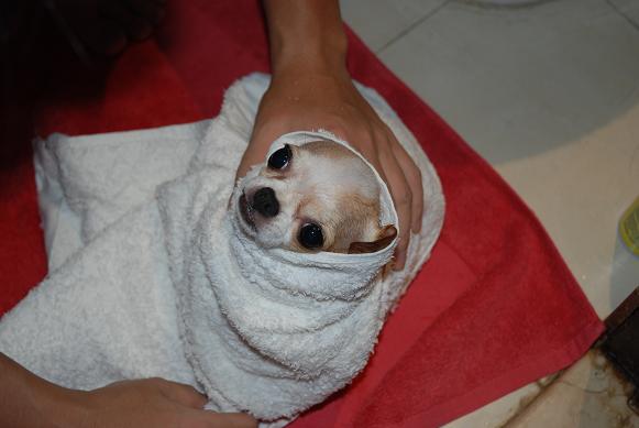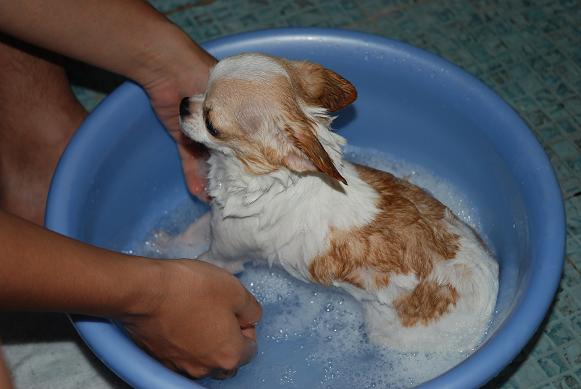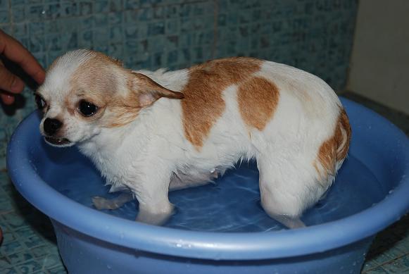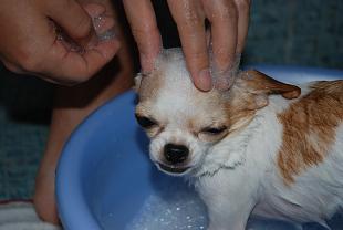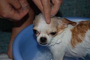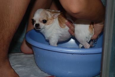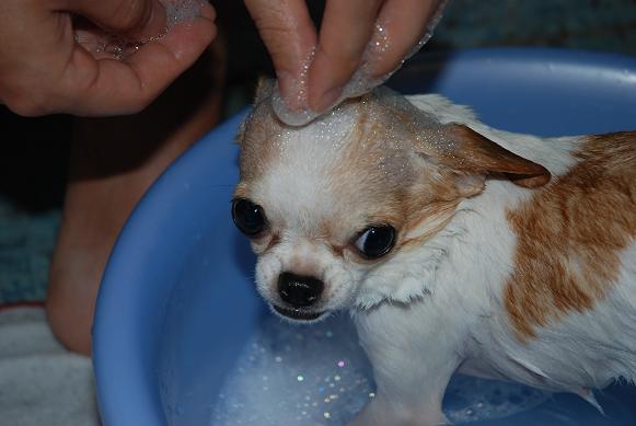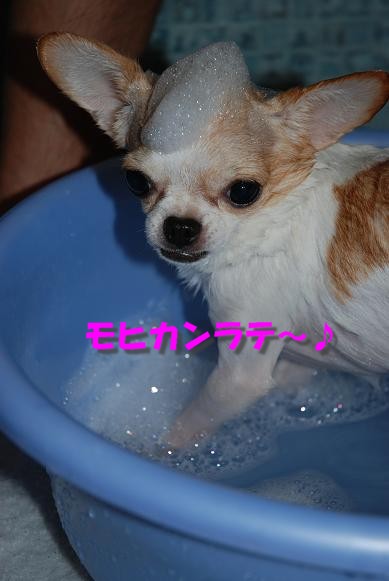 まずはお湯に浸かってね。なぜか涙目のラテ?!f(^^;)